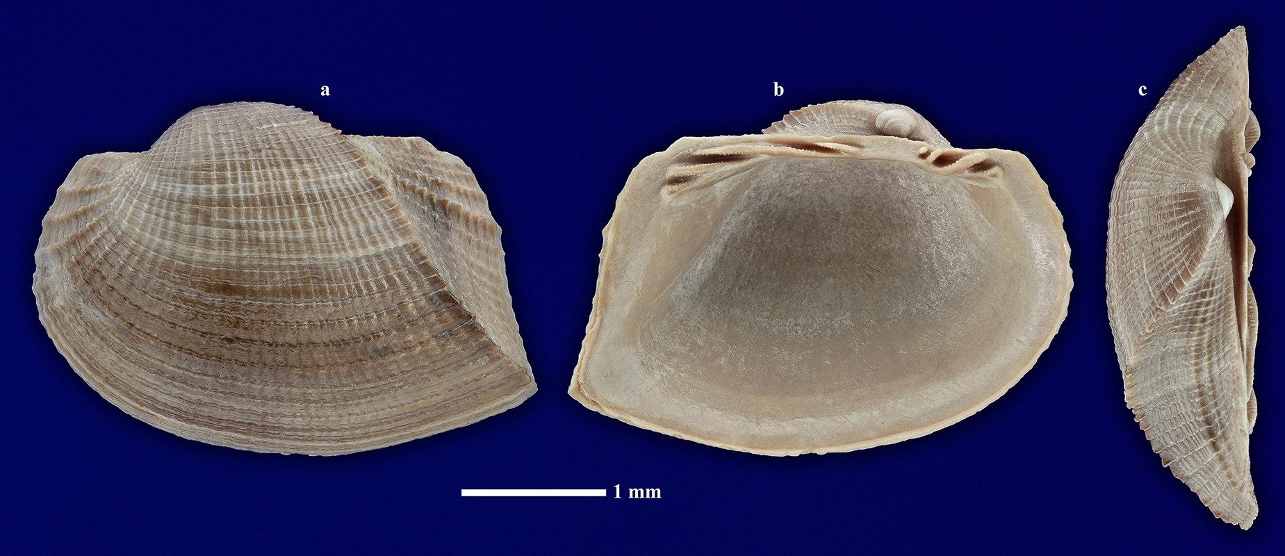 Левая створка раковины ювенильной особи. a - вид с наружной стороны; b - вид с внутренней стороны; c - вид сверху.