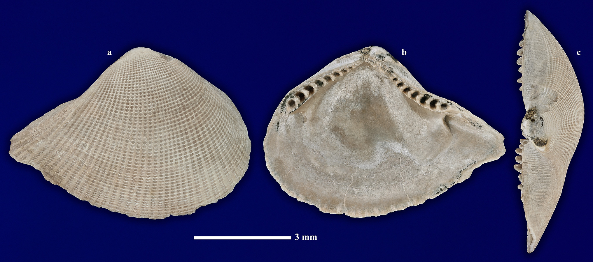 Комментарий. Правая створка раковины взрослой особи. a - вид с наружной стороны; b - вид с внутренней стороны; c - вид сверху.