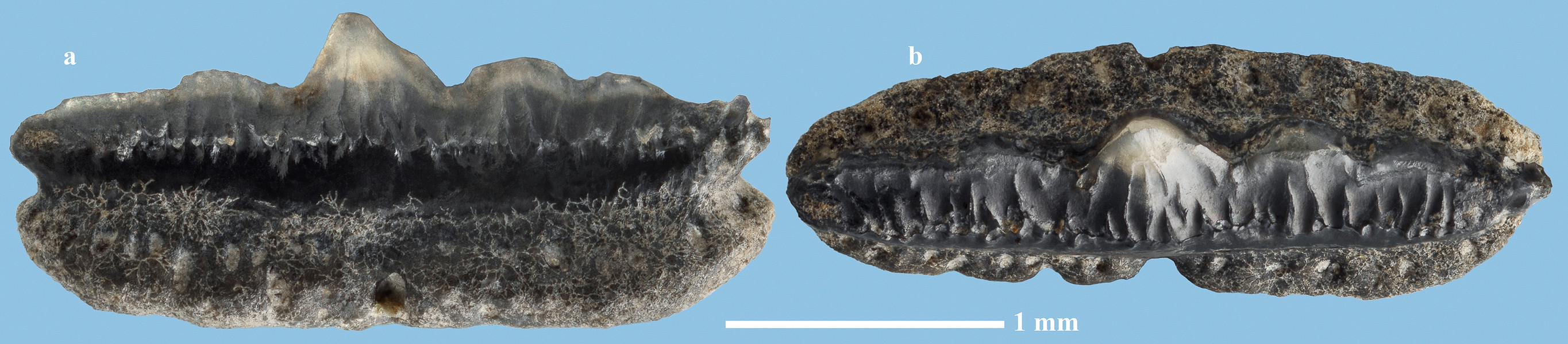 Комментарий. Задний зуб. a - вид спереди; b - вид сверху.