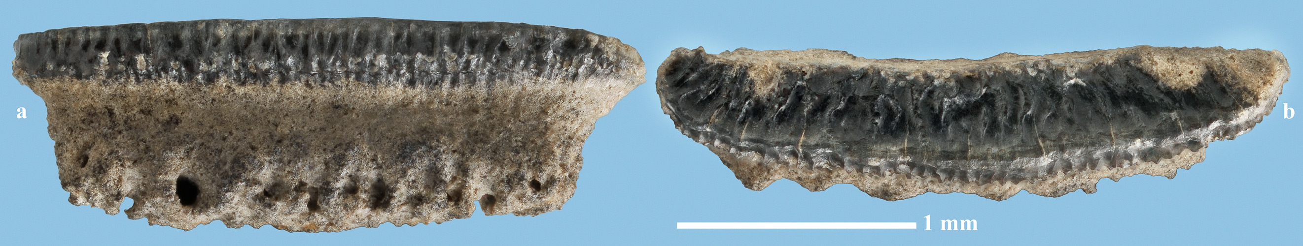 Комментарий. Крайний (?) задний зуб. a - вид спереди; b - вид сверху.