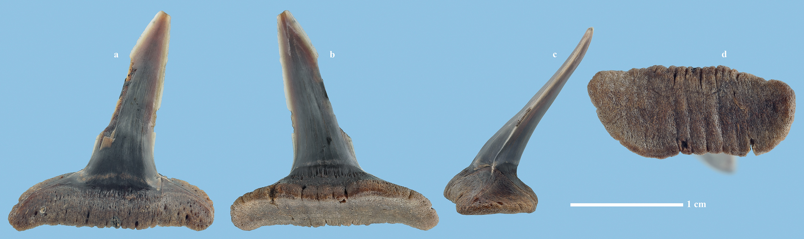 Возможно, предковая форма S. longidens несколько меньшего размера. Боковой нижнечелюстной зуб.