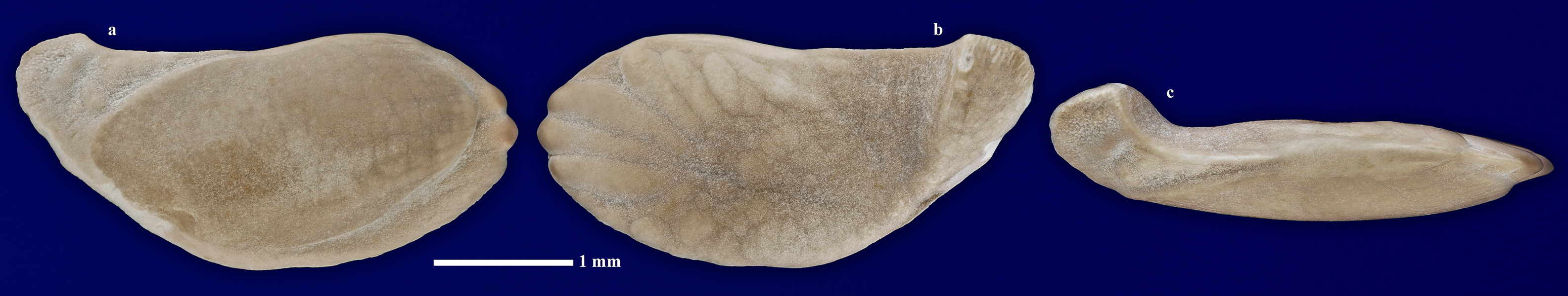 Комментарий. Отолит взрослой особи костной рыбы. a - вид "спереди"; b - вид "сзади"; c - вид "сверху".