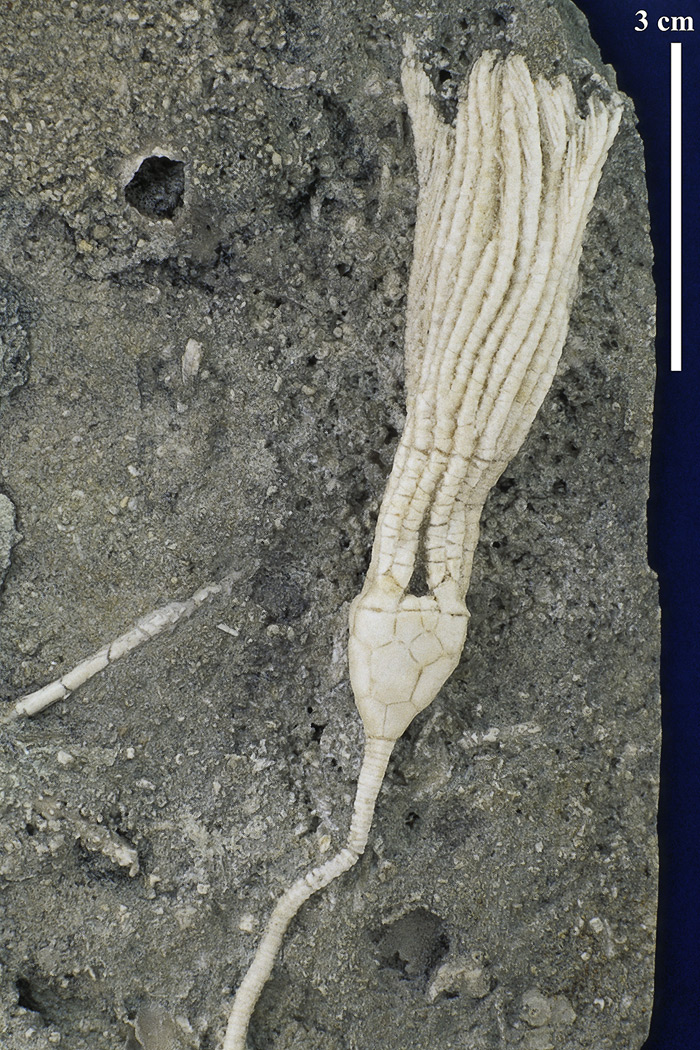 Комментарий. Крона и часть стебля ископаемой морской лилии Hydriocrinus pusillus Trautschold, 1867 на вмещающей породе.