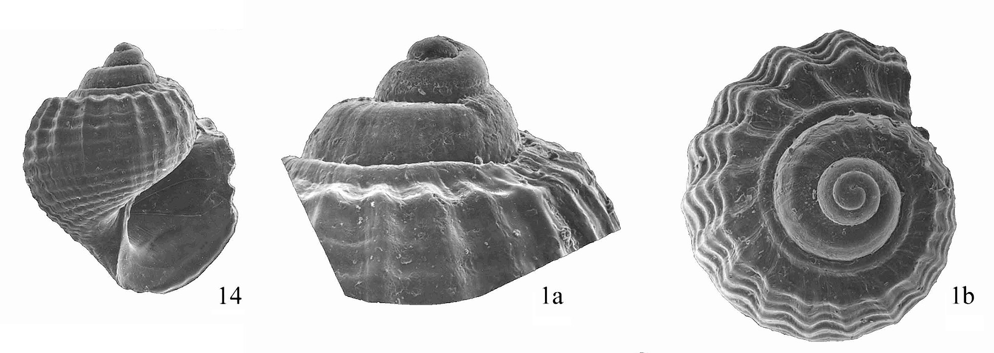 14 - вид со стороны устья (x 22); 1 a) - протоконх (x 63) ; 1 b) - вид сверху (x 30).
