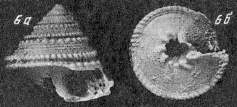 Раковина, замещённая кальцитом. 6 а - вид со стороны устья; 6 б - вид снизу.