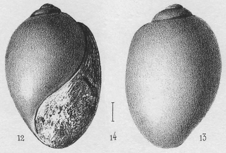 Внутреннее ядро или раковина без наружнего слоя. 12) вид со стороны устья; 13) вид со стороны, противоположной устью;