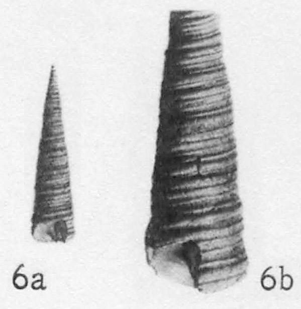 Раковина. Вид сбоку от устья.       6 a - общий вид;       6 b - увеличенный фрагмент.