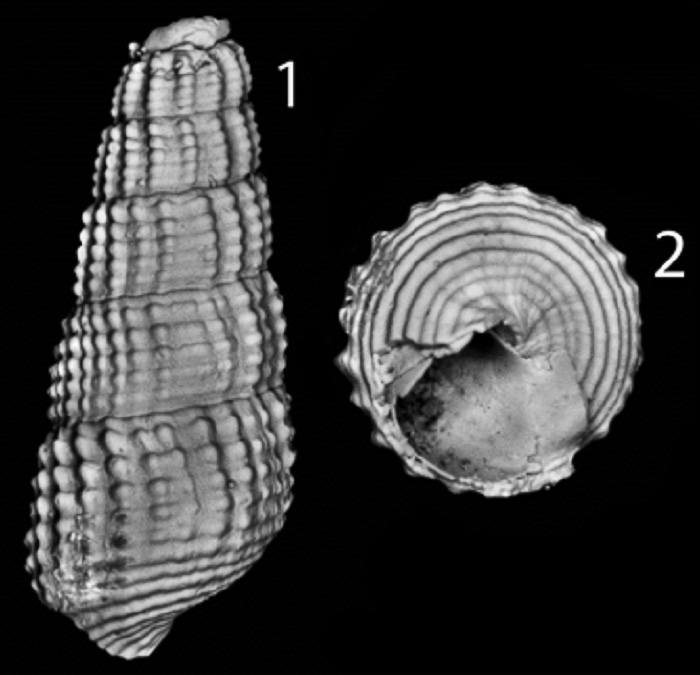 Частично сохранившаяся раковина ископаемого брюхоногого моллюска. 1 - вид со стороны, противоположной устью; 2 - вид снизу.