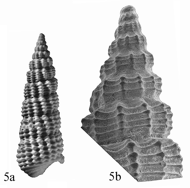 5a: Раковина, вид со стороны, противоположной устью (x 3); 5b: Начальные обороты телеоконха (x 17).