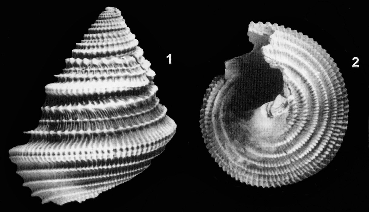 Раковина взрослой особи.      Fig. 1 - вид со стороны, противоположной устью; Fig. 2 - вид снизу.