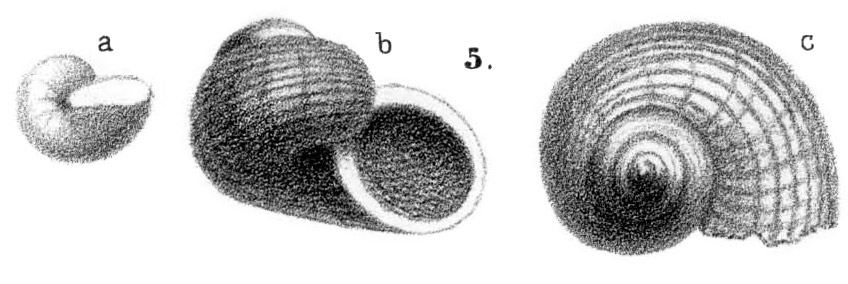 Раковина. 5 a - вид снизу; 5 b - вид со стороны устья; 5 c - вид сверху.