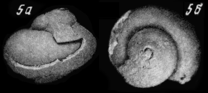 Внутреннее ядро с частично сохранившейся раковиной. 5 а - вид со стороны, противоположной устью; 5 б - вид сверху.