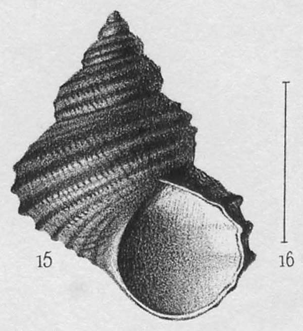 Раковина. 15) вид со стороны устья; 16) натуральная величина образца (только для оригинального оттиска).