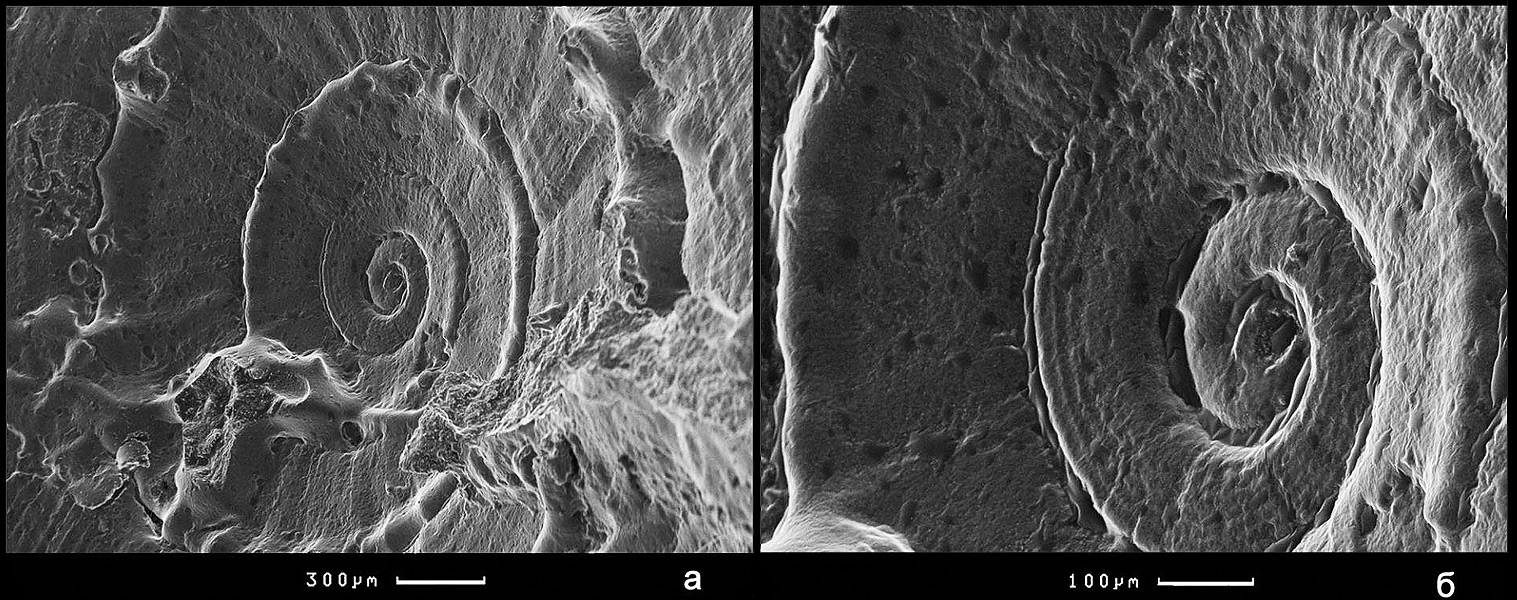 Слепок с отпечатка раковины во вмещающей породе. Морфология ранних оборотов с апикальной стороны.