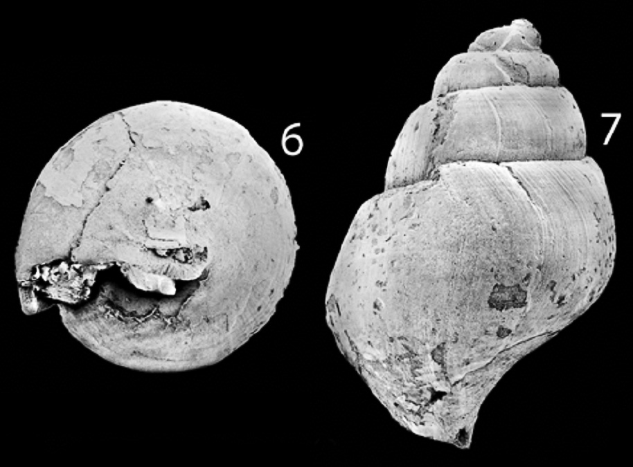 Частично сохранившаяся раковина ископаемого брюхоногого моллюска. 6 - вид снизу; 7 - вид со стороны, противоположной устью.