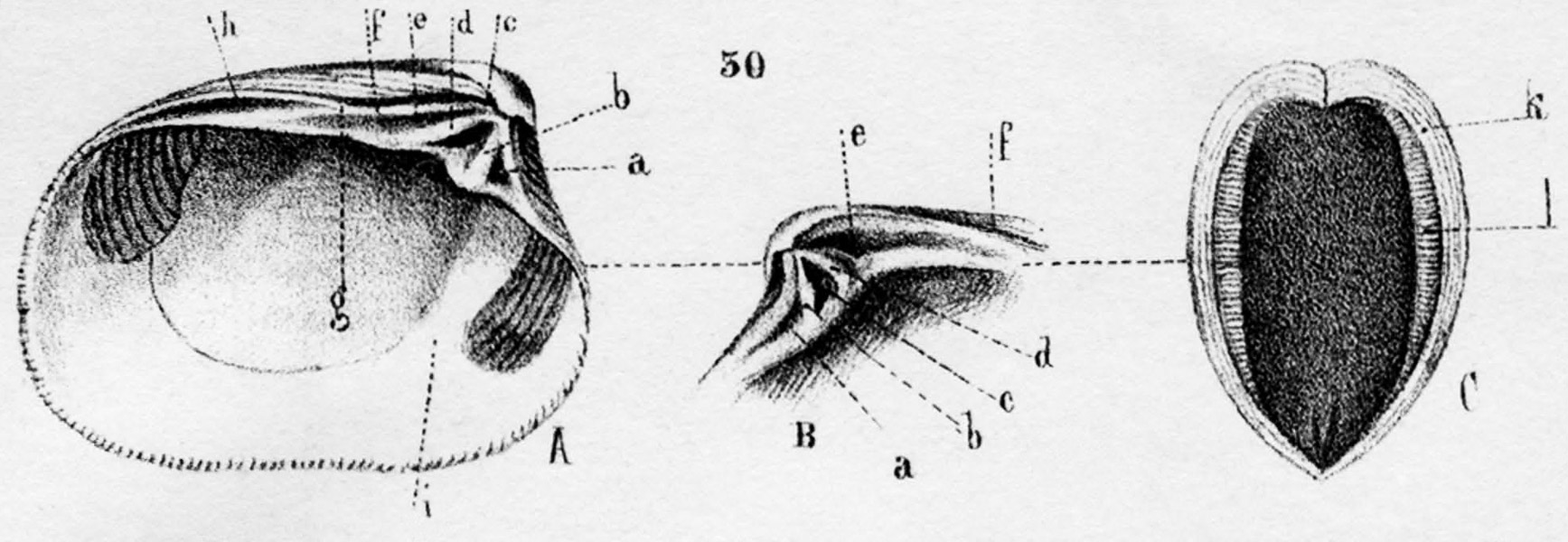 Внутреннее строение раковины. A - левая створка; B - правая створка (частично); C - раковина в поперечном разрезе.