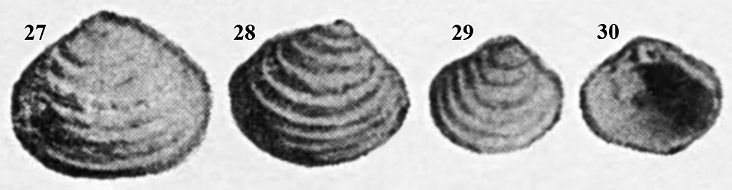 29 - правая створка молодой особи, вид с наружной стороны; 30 - правая створка молодой особи, вид с внутренней стороны.