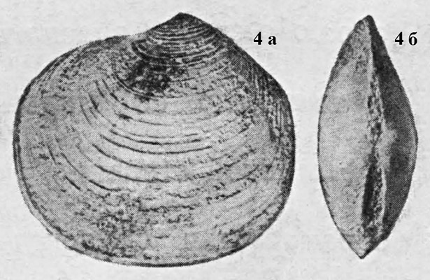Раковина ("типичной разновидности" по П. А. Герасимову). 4 a - вид со стороны левой створки; 4 б - вид сверху.