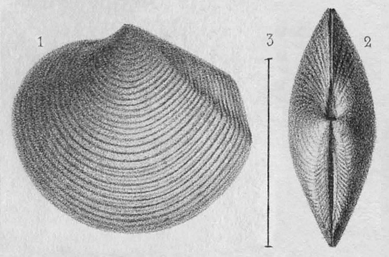 Раковина. 1 - вид стороны левой створки; 2 - вид сверху; 3 - размер экземпляра (верно только для оригинального оттиска).