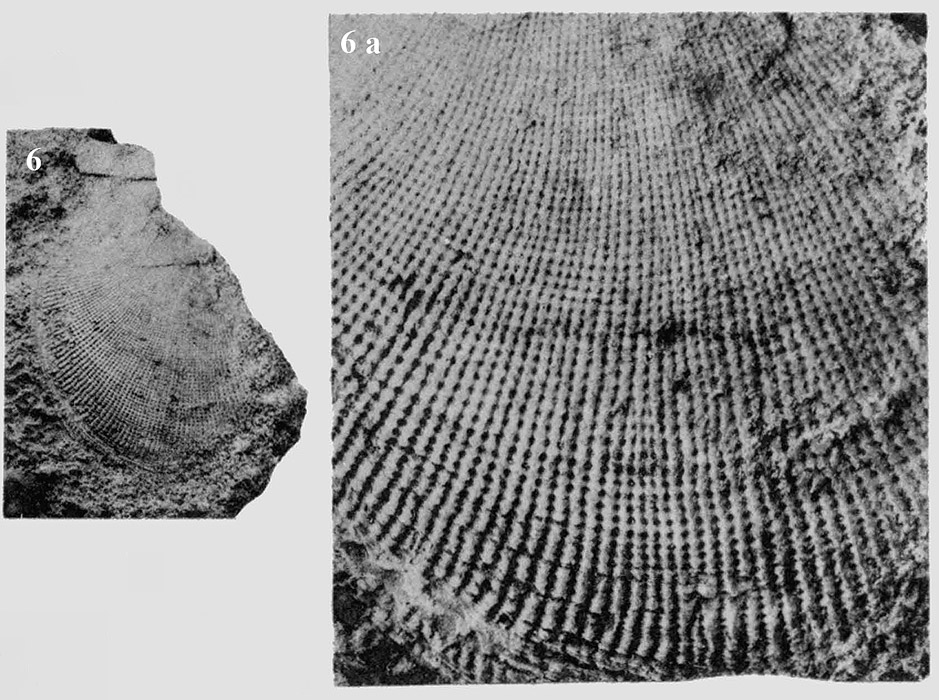 Частично сохранившаяся левая створка раковины на вмещающей породе. 6 - общий вид; 6 a - увеличенный фрагмент.