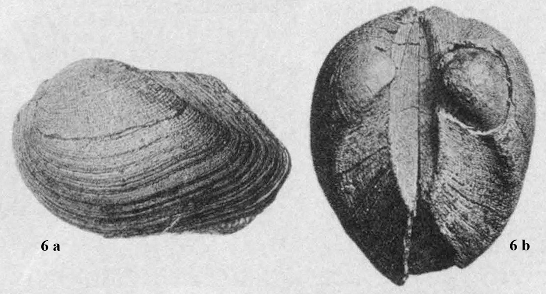 Раковина крупной геронтической особи. 6 a - вид со стороны левой створки; 6 b - вид сверху.