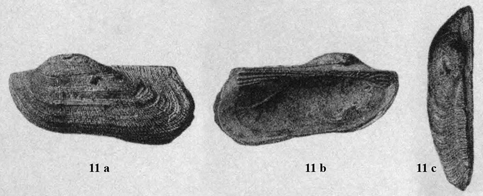 Левая створка раковины. 11 a - вид с наружной стороны; 11 b - вид с внутренней стороны; 11 c - вид сверху.