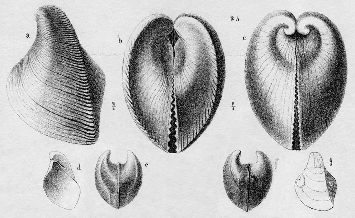 d-g - нат. вел. d - правая створка с внутренней стороны; e, f - внутреннее ядро, вид сбоку; g - левая створка (показано расположение