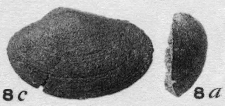 Левая створка раковины. c - вид с наружной стороны; a - вид сбоку.