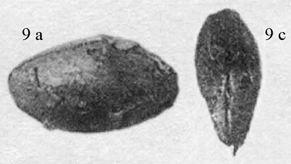 Раковина. 9 a - вид со стороны правой створки; 9 c - вид сверху.