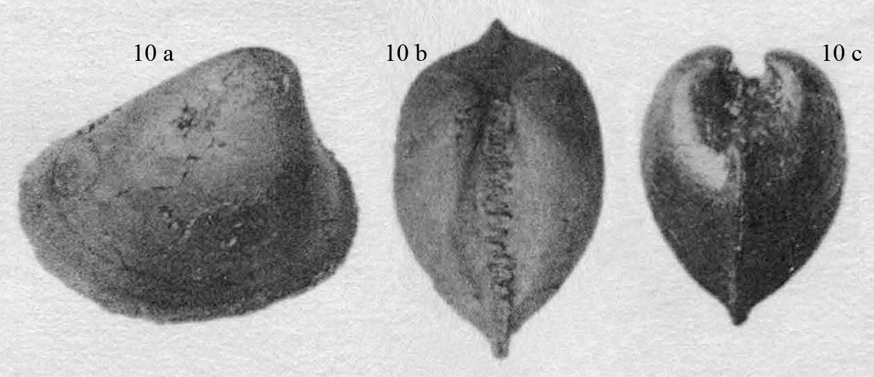 Внутреннее ядро раковины. 10 a - вид со стороны левой створки; 10 b - вид сверху; 10 c - вид сбоку.