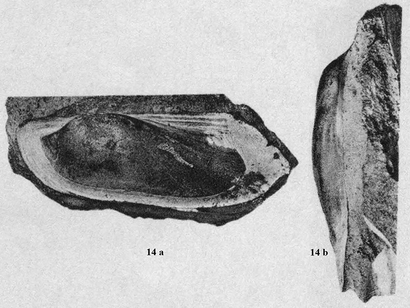Внутреннее ядро левой створки раковины на вмещающей породе. 14 a - вид со стороны левой створки; 10 b - вид сверху.