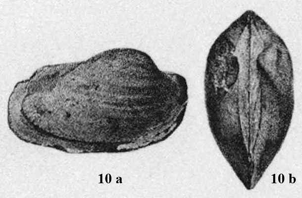 Раковина. a- вид со стороны правой створки; b - вид сверху.