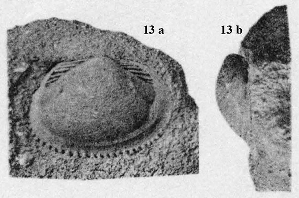 Внутреннее ядро правой створки раковины. 13 a- вид со стороны правой створки; 13 b - вид сбоку.