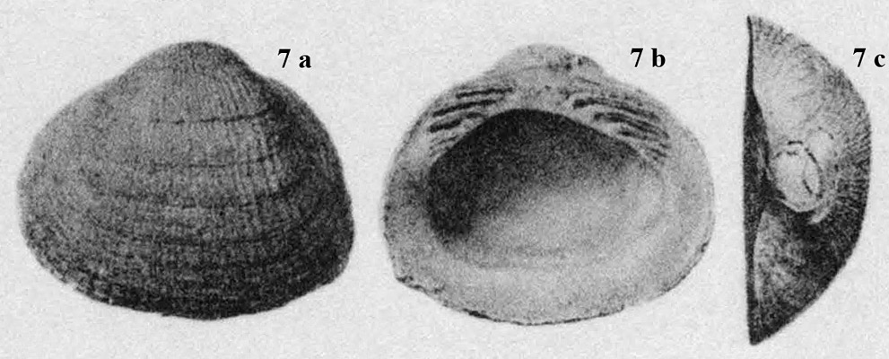Правая створка раковины. 7 a - вид с наружной стороны; 7 b - вид с внутренней стороны; 7 c - вид сверху.