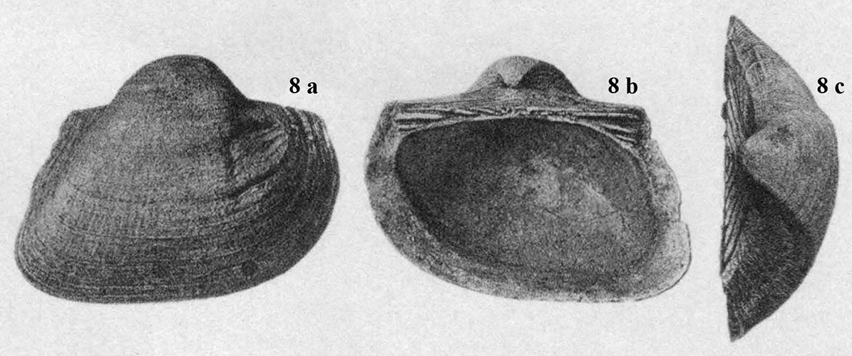 Правая створка раковины. 8 a - вид с наружной стороны; 8 b - вид с внутренней стороны; 8 c - вид сверху.