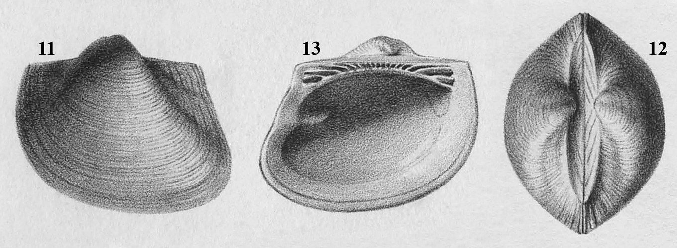 11 - вид с наружной стороны левой створки; 12 - вид с внутренней стороны левой створки; 13 - раковина, вид сверху.