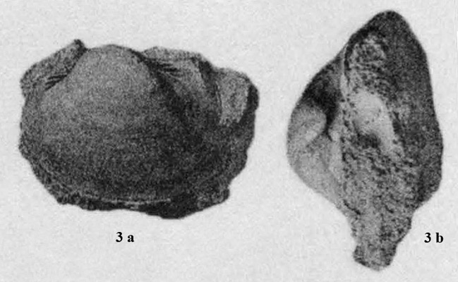 Внутреннее ядро левой створки раковины на вмещающей породе. 3 a - вид со стороны левой створки; 3 b - вид сверху.