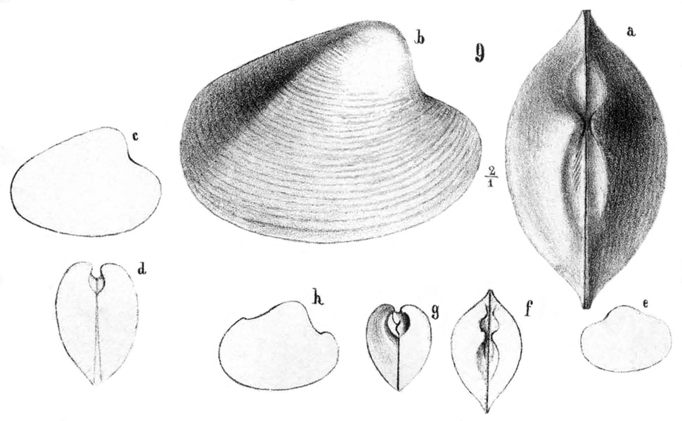 c, d - натур. вел. c - вид со стороны правой створки; d - вид сбоку. h - внутреннее ядро, вид со стороны правой створки.