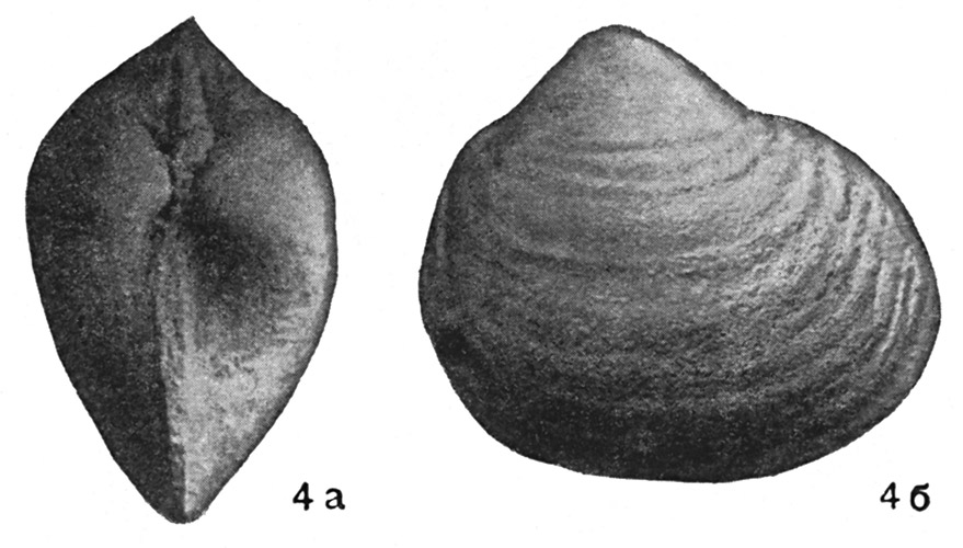 Внутреннее ядро раковины. 4 а - вид сверху; 4 б - вид со стороны правой створки.