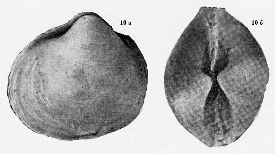 Внутреннее ядро раковины. 10 а - вид со стороны левой створки; 10 б - вид сверху.