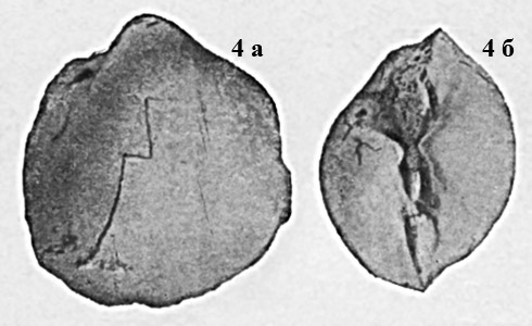 Внутреннее ядро раковины. 4 а - вид со стороны левой створки; 4 б - вид сверху.