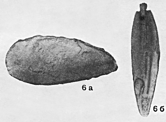Внутреннее ядро раковины. 6 а - вид со стороны правой створки; 6 б - вид со стороны замочного края (сверху).