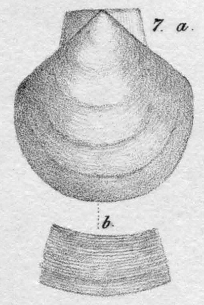 Комментарий. Изображение из: Roemer, 1836, стр. 72, табл. 13, фиг. 7 a, b (скан с полиграфического оттиска; комп. обработка). Правая створка раковины крупной взрослой особи. a - общий вид (с наружной стороны); b - скульптура раковины (увеличенный фрагмент).