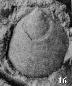 Комментарий. Изображение из: Борисяк и Иванов, 1917, тaбл. 1, фиг. 16 (скан с полиграфического оттиска; комп. обработка). Частично сохранившаяся правая створка раковины ювенильной особи на вмещающей породе. Вид с наружной стороны.