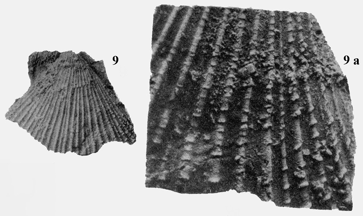 Частично сохранившаяся левая створка раковины. 9 - общий вид; 9 a - увеличенный фрагмент.