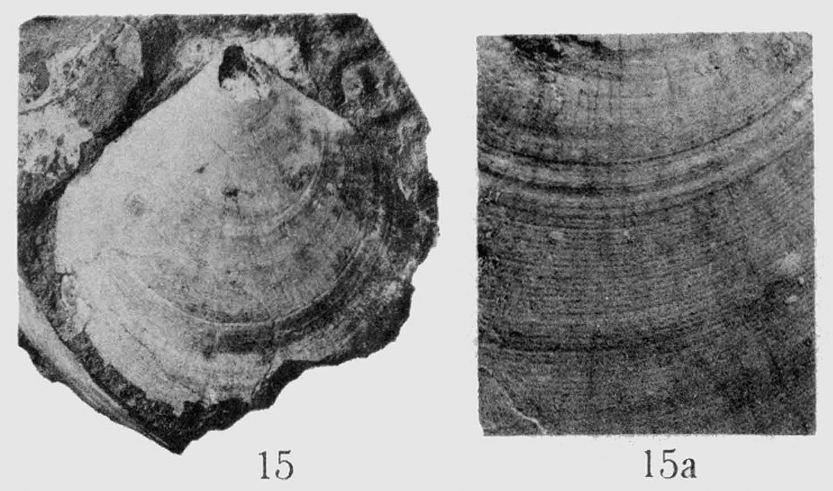 Правая створка раковины на вмещающей породе. 15 - общий вид; 15 a - увеличенный фрагмент.