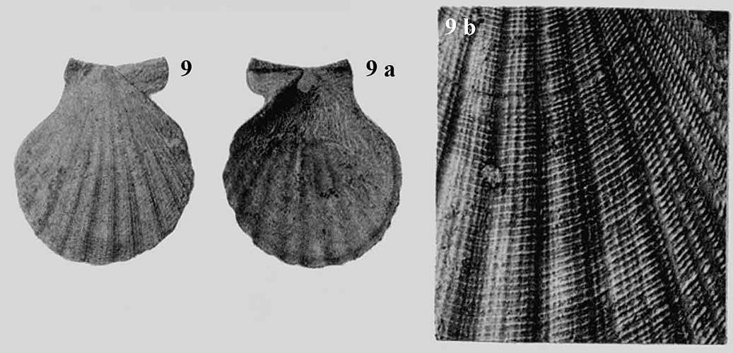 Правая створка раковины. 9 - вид с наружной стороны; 9 a - вид с внутренней стороны; 9 b - увеличенный фрагмент.
