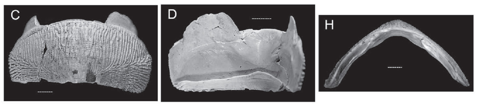 C - вид сверху (dorsal view); D - вид снизу (ventral view); H - вид спереди (frontal view).