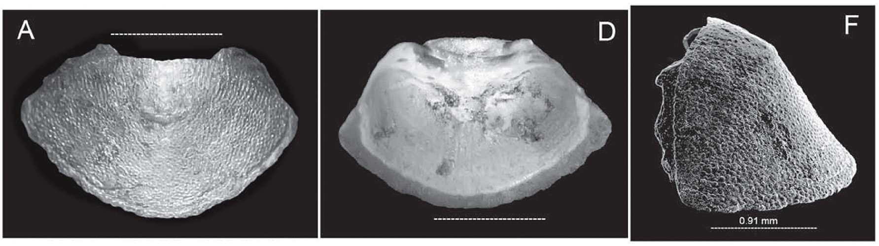 Вид сверху (A), снизу (D) и сбоку (F) - dorsal, ventral and lateral views.
