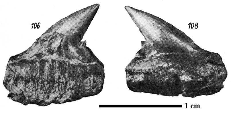 Изображение из: Из: Зонов и Хабаков, 1935, табл. 4, фиг. 106, 108 под названием "Notidanus sp. ind.". (скан с полиграфического оттиска, комп. обработка).